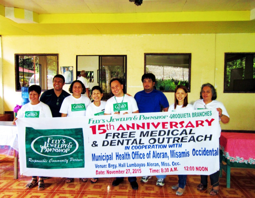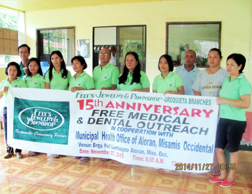 The Fely’s Jewelry and Pawnshop – Oroquieta Branches have established it’s First branch in this capitol city of Misamis Occidental on October 18, 2000, which is why the promised Free Medical and Dental Outreach Mission usually falls on the third or fourth week of the month of October each year. The said outreach missions had been done without let-up in every year since the year 2001 and had been done not only in the barangays within the City of Oroquieta but also at the adjacent barangays of the Municipalities of Aloran and Lopez Jaena which are all within the area of operation of Fely’s Jewelry and Pawnshop – Oroquieta Branches.